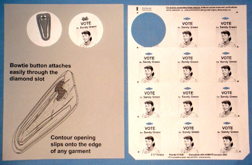 A round button display for political and action campaigns - provides better exposure for less money. Printable on front & back, low cost and clothing-safe for both women and men. Replaces the traditional metal button with pin by being eco-friendly, clothing-safe, child-safe and easy-to-attach.