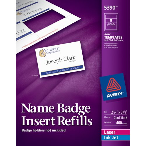 Who's that walking down the hall? These Name Badge Inserts help you identify everyone in your building. Design badges complete with names, titles and logos using free templates from avery.com. No need to mess with margins—just type and print from any inkjet or laser printer. After that, tear out and insert the badges into compatible Avery name badge holders (available separately). Now you can put names to those unfamiliar faces. For use with Avery name badge holders (available separately) Inkjet and laser compatible Use downloadable Avery blank and predesigned templates that give you professional-looking designs quickly Avery name badge refills give you professional-quality results right at your desktop